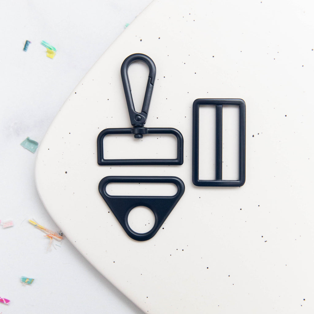 Sling/Crossbody Bag Hardware Kit contains: 1 Triangle Ring, 1 Swivel Hook and 1 Tri Glide Slider Buckle