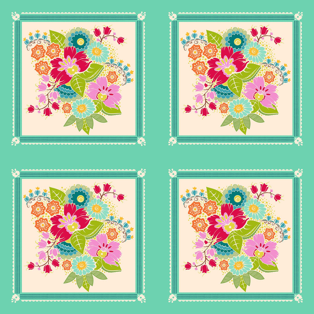 Sold as panel prints. One panel is about 23" by 44/45" and contains 6 floral squares.  Each floral square measures about 10 1/4 by 10 1/4"