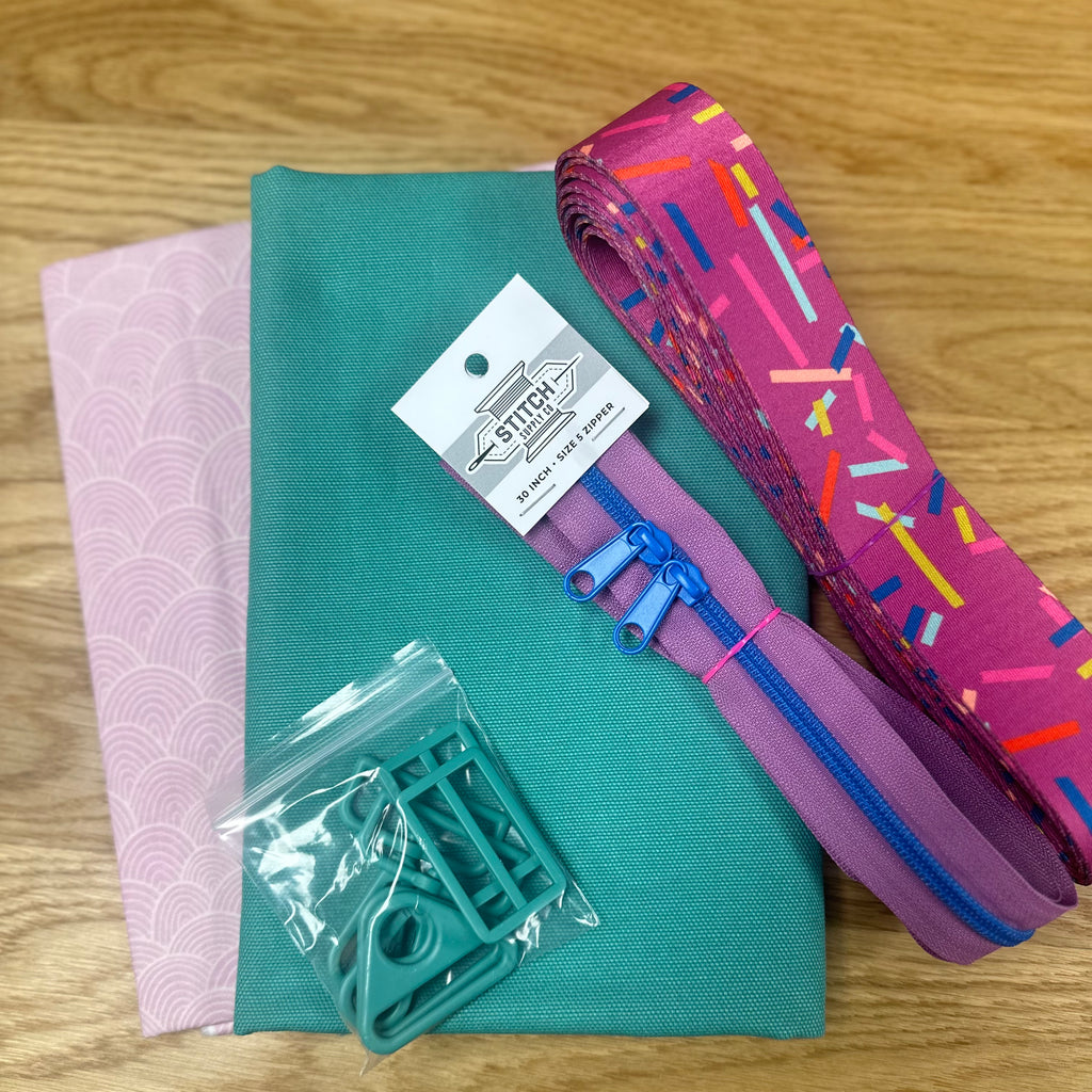 Kit contains: 3/4 yard exterior, 1 yard lining, 4 yards webbing and hardware.  Kit DOES NOT contain the pattern, SF101 or fusible fleece.