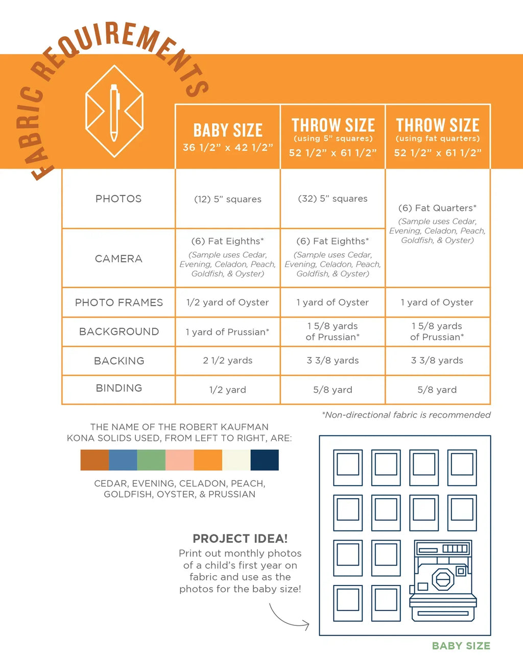 Smile for the camera! Snap Happy, recommended for advanced beginner sewist & up, is a charm square & fat quarter-friendly pattern that includes instructions for making a baby size (36 1/2" x 42 1/2") and throw size quilt (52 1/2" x 61 1/2"). The pattern features separate cutting instructions for the Camera block (14" x 17") which allows for easy incorporation into smaller projects. Snap Happy primarily consists of straight seams making for speedy quilt top assembly! This 17-page pattern is complete with block diagrams, labels for organizing your cuts of fabric, step-by-step detailed instructions, and colorful illustrations.
