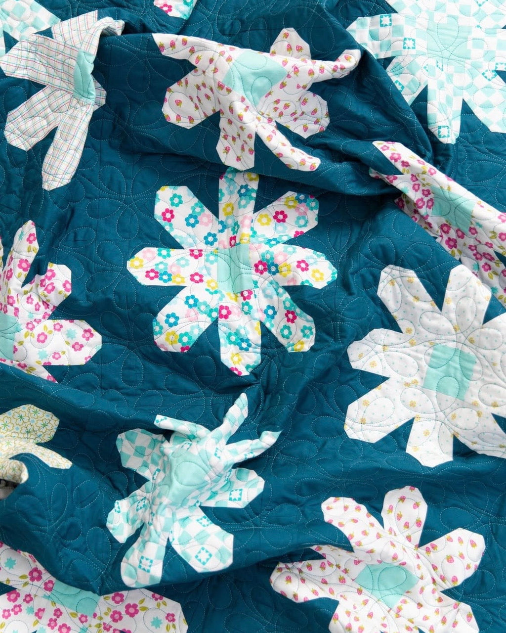 The Fresh as a Daisy pattern is a traditionally pieced quilt that includes instructions for two different versions - modern and scrappy. Each version comes in either baby (48" square) or throw size (59 1/2" x 63 1/2"). Pattern is fat quarter and jelly roll friendly too.