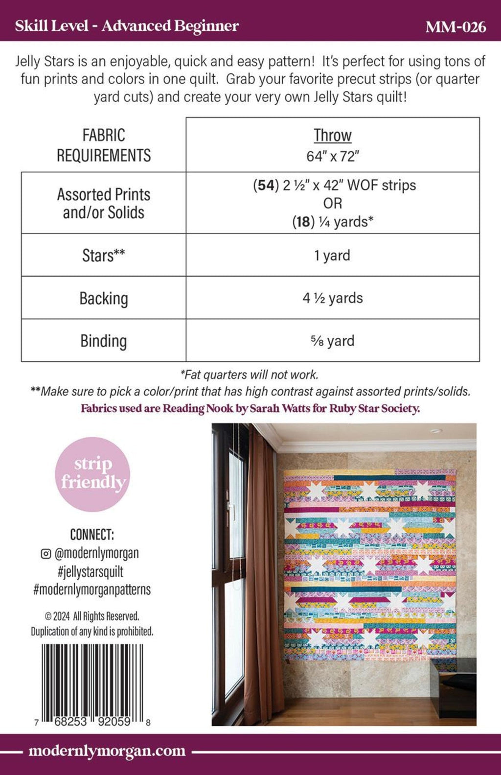Jelly Stars is an enjoyable, quick and easy pattern! It’s perfect for using tons of fun prints and colors in one quilt. Grab your favorite precut strips (or quarter yard cuts) and create your very own Jelly Stars quilt! Throw size - 64" x 72".